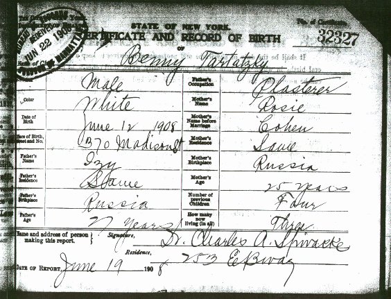 Birth Records Birth records contain a wealth of information including name of child, birth date, name and age of father, name and age of mother (including maiden name). In some locales it adds the number of previous children. Pictured above is the 1908 birth record of Benny Tartasky to Israel and Rose Tartasky, the grandparents of Richard Waldman. The child apparently died very young because he does not appear in the 1910 census. There is no death record. Birth records are important genealogical records because they are primary evidence, having been created when the event (the birth) occurred. It may be the only source of the mother's maiden name. Ages and places of birth of parents give clues as to where to search for their birth records. |